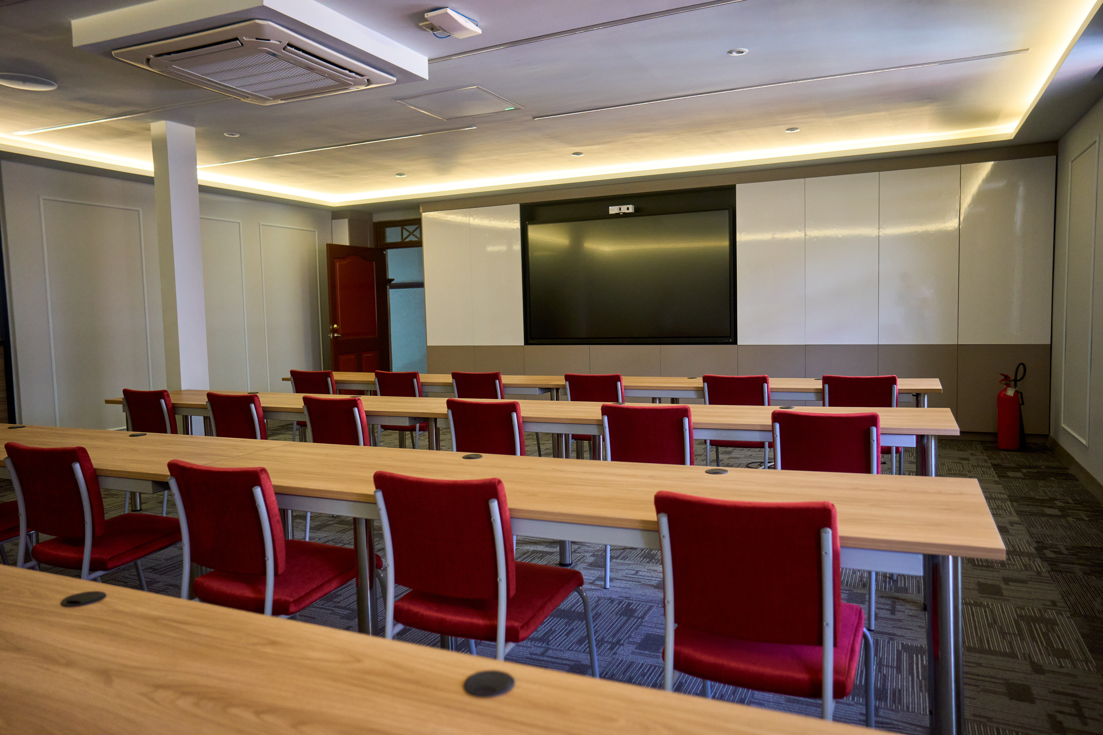 El diseño integra tecnología y funcionalidad, con una gran pantalla interactiva empotrada en un mueble de uso múltiple que también funciona como pizarra. Además, el aula incorpora tres modos de iluminación que se adaptan a distintos tipos de clases e interacciones, generando versatilidad y confort para estudiantes y docentes.