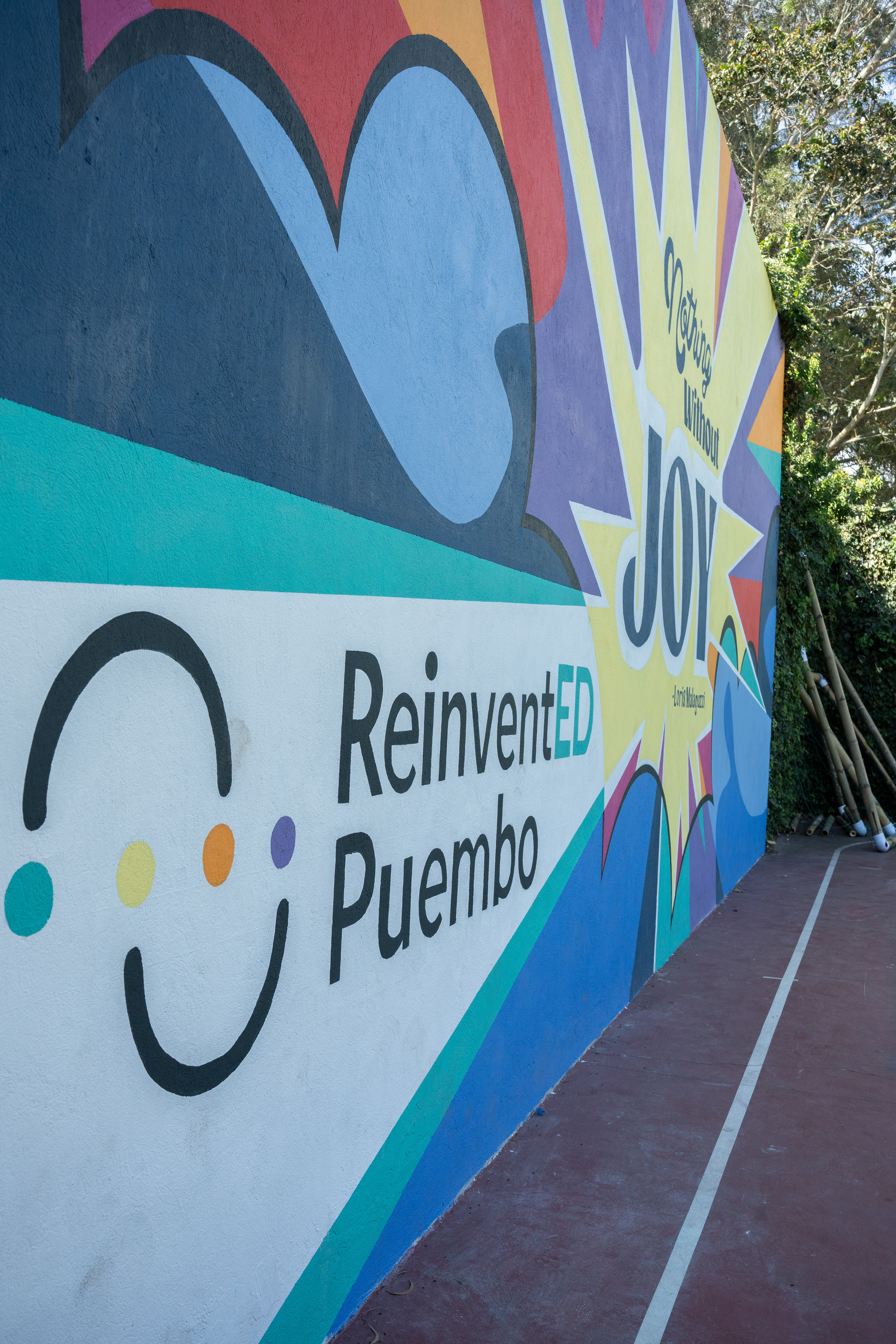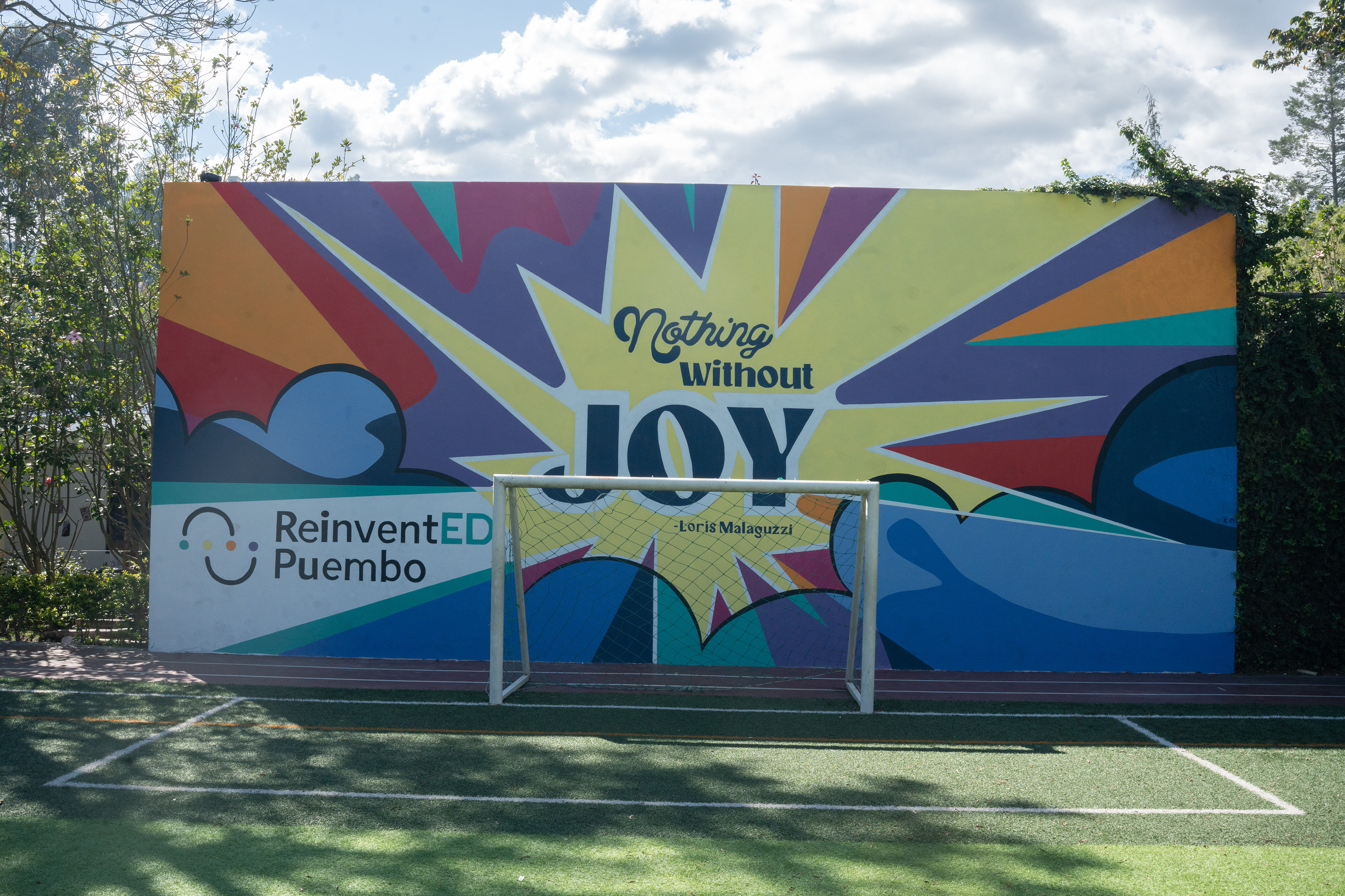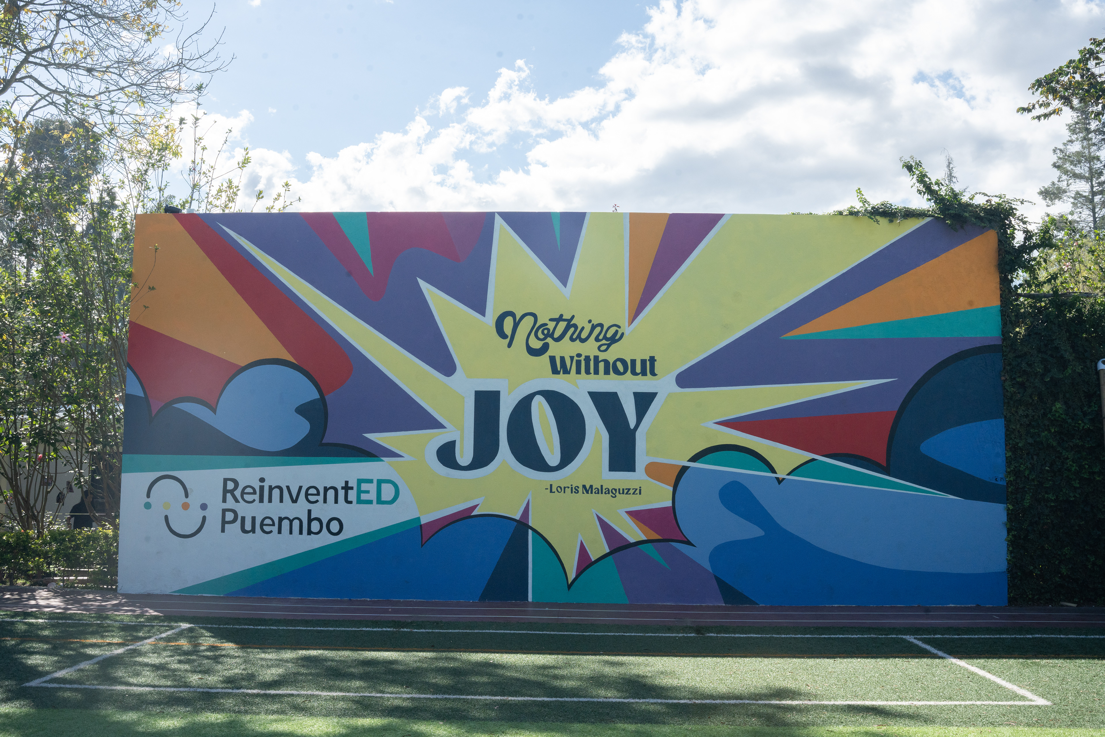 Se transforma el colegio con un mural arquitectónico inspirador. Siguiendo la frase “Nothing Without Joy” de Loris Malaguzzi, llenamos de color y creatividad cada rincón.